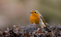 Roodborst scharrelt tussen de bladeren naar voedsel
