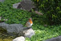 Een roodborstje komt zich wassen in de waterloop in onze tuin. Nieuwsgierig kijkt de kleine vogel om zich heen. Als er een andere vogel in de buurt komt laat de roodborst de rode veren zien om het territorium te verdedigen.