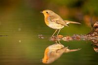 Het Roodborstje neemt een bad in een mooi ochtendzonnetje. Deze foto komt het mooiste uit als ie afgedrukt wordt op acryl of metaal.