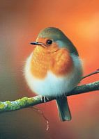 Schattig roodborstje rustend op een tak, met een serene en vredige uitstraling. Het vogeltje is met hoge precisie geschilderd, waardoor het zachte verenkleed en de delicate kenmerken van het roodborstje prachtig tot hun recht komen. De achtergrond vervaagt in een warme, oranje gloed die de atmosfeer van een zonsondergang suggereert, waardoor het tafereel een rustgevende kwaliteit krijgt.
