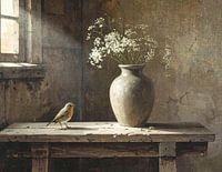 Een roodborstje staat op een oude verweerde tafel. Op de tafel staat een stenen vaas met bloemen erin. Sfeervol kunstwerk in landelijke stijl.