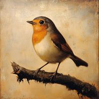 De achtergrond is zacht en vaag, in warme beige en lichtbruine tinten, waardoor het roodborstje volledig centraal staat in de compositie. Het gebruik van subtiele kleurvariaties in de achtergrond geeft een zachte, tijdloze sfeer aan het schilderij. De eenvoudige maar elegante compositie benadrukt de natuurlijke schoonheid en sereniteit van de vogel in zijn rustmoment.