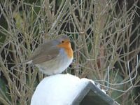 Dit roodborstje houd zich warm in de sneeuw