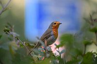Roodborstje in de struiken met blauw verkeersbord op de achtergrond