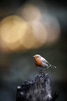 Roodborstje met mooie achtergrond door de herfstkleuren en het zonicht dat op de bladeren schijnt.
