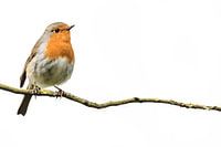 Minimalistische foto van een roodborstje, zittend op een tak.