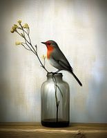 De fles is minimalistisch en helder, waardoor het licht subtiel wordt gebroken en reflecties ontstaan die de sfeer intiem en sfeervol maken. In de fles steekt een dun takje met fijne gele bloemen, een delicaat accent dat de komst van de lente symboliseert. Het roodborstje, met zijn warme roodbruine borst en zachte grijze veren, lijkt op natuurlijke wijze deel uit te maken van de compositie. Het poseert rustig, alsof het zich bewust is van zijn rol als middelpunt van dit tafereel.