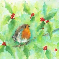 Roodborstje in een hulststruik vierkant is een aquarel schilderij geschilderd door de kunstenaar Karen Kaspar. Een roodborstje zit op een tak in een hulststruik en kijkt naar rechts. Het wordt omringd door groene bladeren en rode bessen. De achtergrond is vormgegeven met losse penseelstreken in verschillende groentinten, die een sterk kleurcontrast vormen met de rode winterbessen van de struik en de roodoranje borstveren van de vogel. De ilex wordt ook wel hulst genoemd. De groenblijvende takken met de rode vruchten worden vaak gebruikt voor kerstdecoraties.