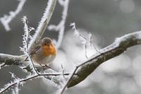 Op een prachtige winterse dag poseerde dit roodborstje op een berijpte tak. Zijn rode borstje steekt mooi af tegen de wit grijze omgeving.