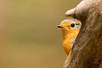 Een klein roodborstje verstopt achter een boomstam. Net op het moment dat ze kijkt een foto gemaakt. Een prachtig klein vogeltje.