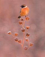 Roodborsttapuit (Saxicola rubicola) zittend op een plant met fraai ochtendlicht.