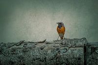 Deze sfeervolle afbeelding toont een roodborsttapuit die trots en alert op een verweerde boomstam zit, omgeven door een zachtgroene, getextureerde achtergrond die de natuurlijke tinten van zijn verenkleed prachtig laat uitkomen. De warme oranjebruine borst contrasteert met het donkere masker van zijn kop en de ruwe, grijze bast waarop hij balanceert. Het werk ademt een rustige, aardse energie en nodigt uit tot verstilling, perfect voor een natuurminnend interieur met oog voor detail en eenvoud.