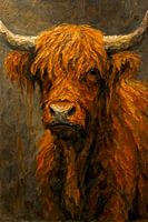 Dit schilderij toont een imposante Schotse hooglander in warme, diepe roesttonen. Zijn lange, warrige vacht is vol textuur aangebracht met stevige penseelstreken, die bijna tastbaar zijn. De massieve hoorns steken krachtig uit het beeld, maar de blik is zacht en kalm. Een prachtige balans tussen kracht en rust. De achtergrond is sober, in donkere aardetinten, zodat de vurige roodbruine vacht echt naar voren komt.