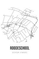 Zwart-witte landkaart, stratenplan of plattegrond van Roodeschool. Roodeschool is gelegen in de gemeente Het Hogeland, provincie Groningen. Op de stadskaart zijn alle openbare wegen in Roodeschool opgenomen. Verder is de kaart voorzien van de coördinaten van het centrum van Roodeschool.