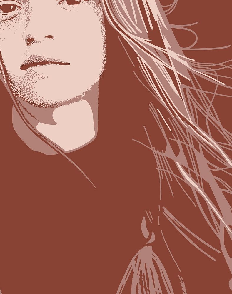 Een digitaal portret van een roodharig meisje in drie tinten roodbruin. De kleur van haar haar vond ik zo mooi dat ik deze in de tekening wilde laten domineren en het portret door dit kleurcontrast wilde laten spreken.