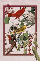 Dit beeld van John James Audubon is van de roodvogel. Het beeld vult deze collage, aangevuld met botanische elementen en omlijst met een gekleurde lijst om het geheel het best tot zijn recht te brengen. De herfstige elementen van fruit dat overrijp is brengen warmte in het beeld.