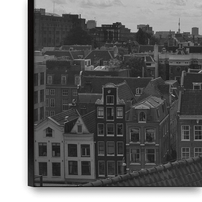 Een stoer en grafisch stadsgezicht van Amsterdam, gezien vanaf grote hoogte. De combinatie van klassieke Amsterdamse daken en de verre horizon geeft deze foto een moderne, bijna industriële uitstraling. Door de monochrome tinten past dit werk uitstekend in een strak of Scandinavisch interieur. Een beeld dat telkens weer nieuwe details…