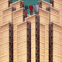 Het schone wasgoed aan de waslijn vormt een schril contrast met de monumentale en herhalende architectuur eromheen.