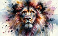 Een leeuw vult het kader in een close-up portret, naar voren kijkend met een vaste, waakzame blik. De manen zijn opgebouwd uit gelaagde wassingen en sterke contrasten, waarbij wordt geschakeld tussen warme okers, diepe bruintinten, houtskoolschaduwen en koele blauwtinten. Rond het hoofd creëren losse kleuruitbarstingen een levendige…