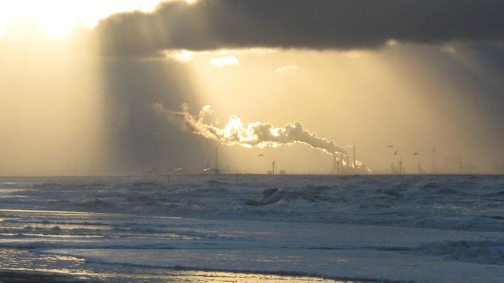 Aan de horizon, onder een dik wolkendek, waarachter de zon zich verschuilt, worden de contouren van de Maasvlakte zichtbaar. Vanaf het Scheveningse strand trok die ene rookpluim mijn aandacht.