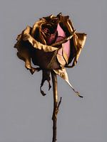 De foto toont een verwelkte, goudkleurige roos met droge, gekrulde bloembladeren en bruine, verwelkte bladeren aan de stelen. De achtergrond is donker, wat een dramatisch en melancholisch contrast creëert met de gouden tinten van de roos. Het geheel heeft een artistieke, bijna surrealistische uitstraling, mogelijk symboliserend…