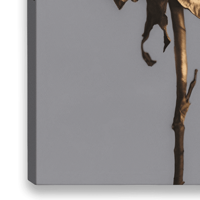 De foto toont een verwelkte, goudkleurige roos met droge, gekrulde bloembladeren en bruine, verwelkte bladeren aan de stelen. De achtergrond is donker, wat een dramatisch en melancholisch contrast creëert met de gouden tinten van de roos. Het geheel heeft een artistieke, bijna surrealistische uitstraling, mogelijk symboliserend…