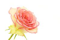 Een grootbloemige witte roos met een knalroze rand aan de bovenkant van het bloemblad. De subliem zoete wit-roze kleurschakering maakt er een lieftallige roos van.