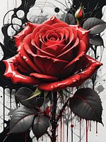 Dit kunstwerk toont een weelderige rode roos tegen een dramatische achtergrond van zwart-witte abstracte vormen en spatten. De combinatie van realistische details in de roos en de expressieve, bijna chaotische achtergrond creëert een sterk contrast dat het oog van de toeschouwer blijft boeien. De stijlen die hierin te herkennen zijn,…