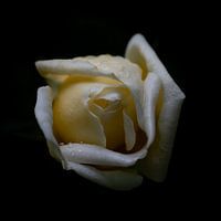 Roos met waterdruppels in een donkere omgeving. Foto is gemaakt in "Maison et Jardins de Claude Monet" in Giverny (Frankrijk). Het is een bloem van een struikroos die in een donkere omgeving in het zonlicht lag. In de nabewerking is de toch al donkere omgeving nog donkerder gemaakt waardoor de bloem lijkt uit het donker tevoorschijn te komen. Hierdoor krijg je een enigszins magisch beeld.