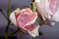 De nog gesloten bloesem van een roos. De roze roos draagt de regendruppels van de vorige nacht op haar bloemblaadjes. Een hele mooie close-up.