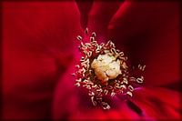 Het hart van een Roos met stamper en meeldraden gefotografeerd aan de kerk van Oud-Valkenburg in het Zuid-Limburgse heuvelland. Er is in de omtrek in lichte mate een Blur-filter toegepast om de meeldraden extra focus te geven.