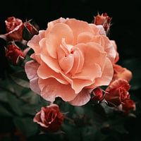 Kijk haar eens schitteren, deze oranje /roze roos volop in bloei te midden van enkele roosjes nog in hun knop. Ik vind haar adembenemend mooi. Wie krijgt er nu niet spontaan een romantische bui van deze schoonheid.