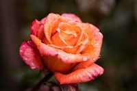 Close-up van een dauw bedekte oranje rode roos in de tuin.