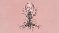 Een fijnzinnige illustratie waarin een gloeilamp uit de aarde lijkt te groeien, haar wortels vertakt als een levend organisme. Root of Light symboliseert de verbinding tussen natuur en creativiteit — hoe ideeën wortelen, groeien en licht brengen. De subtiele roze achtergrond en het lijnenspel geven het werk een poëtische, dromerige…