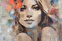 Rosa Portret - abstract schilderij / mixed media kunst geschilderd. Mooi contrast tussen het verfijnde portret en rauwe collage/schildertechniek.