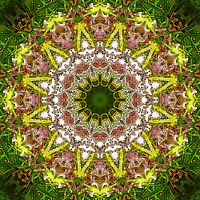 Een twaalfpuntige ster in groene, witte en roze tinten, gebaseerd op een foto van de bloemen van een rhododendronstruik in de lente.