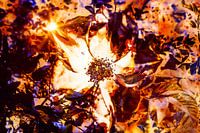 De kunstzinnige roos en de kleine vogel. Het vogeltje geniet van de laatste warme zonnestralen en de aanblik van de mooie roos. De kleuren zijn meerdere tinten warm oranje en heel diep paars.