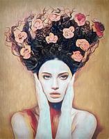Fantasie portret in voornamelijk bruin,geel en rode tinten. Abstracte versie. Mixed media schilderij. Een roos haardag:)