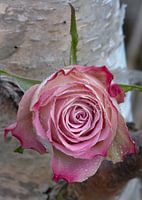 Ina Hölzel fotografie. Roze roos met een berkenstam als achtergrond voor de mooie kleur en structuren.