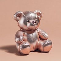 Een teddybeer van glanzend rosegoudkleurig materiaal, balancerend tussen speelgoed en sculptuur. Warmte en luxe smelten samen in een verrassend speels object.