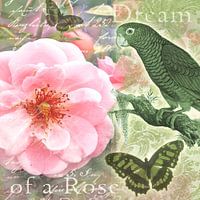 Collage mit Rose, Papagei, Schmetterlingen, Schriftzügen und ornamentalen Mustern digital im Vintage Stil umgesetzt.