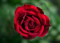 Macro foto van een roos. Van bovenaf gefotografeerd rode roos met groene onscherpe achtergrond.
