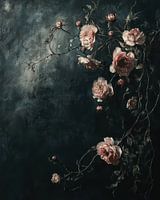 Een poëtisch en melancholisch bloemstilleven, geschilderd in diepe chiaroscuro-tinten. De tere roze rozen lijken te zweven tegen een duistere achtergrond van met olieverf gesuggereerde textuur. Dit kunstwerk ademt een verstilde schoonheid die doet denken aan oude meesters, maar met een moderne, mysterieuze twist. Perfect voor liefhebbers van romantiek, duisternis en verfijning — een tijdloos stuk voor aan de muur.