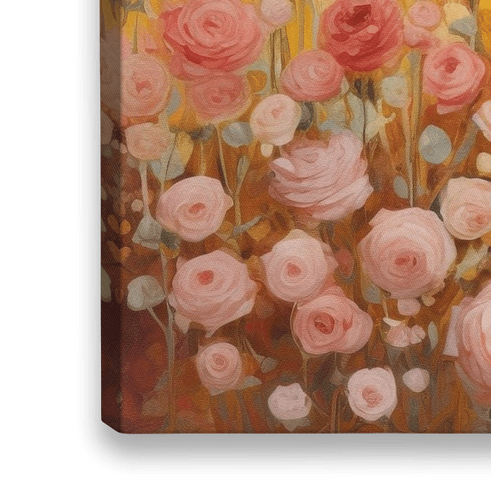 "Roses on Gold" is een digitaal schilderij van rose en rode rozen in bloei op een gouden achtergrond. Het werk geeft een warme elegante uitstraling aan uw interieur!