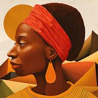 Moderne, vrolijke kunst, met warme bruintinten, geel en rood.