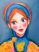 Rosie is een krachtig portret van een vrouw die helemaal in balans is. Haar warme uitstraling geeft je direct energie en inspiratie. De rustige smoke blauwe achtergrond laat de kleuren geel en roze stralen. Door het gebruik van deze kleurcombinatie brengt deze unieke Rosie leven in elke ruimte.
