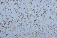 Een groep rosse grutto's is op zoek naar een hoogwatervluchtplaats in de Waddenzee.