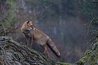 Rotfuchs ( Vulpes vulpes ) im Winterfell, steht im Regen auf einem Baum, auf den er zuvor geklettert war und schaut sich um, dunkles, natürliches Bild, wildlife, Europa.