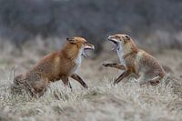 Red Foxes / Rotfuechse ( Vulpes vulpes ), two adults, sitting on their hind legs, in agressive fight, fighting, threatening, attacking each other, wildlife, Europe.