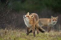 Red Fox / Rotfuchs ( Vulpes vulpes ) two together in natural surrounding, on a rainy day, one is watching up to falling raindrops, funny, wildlife, Europe.